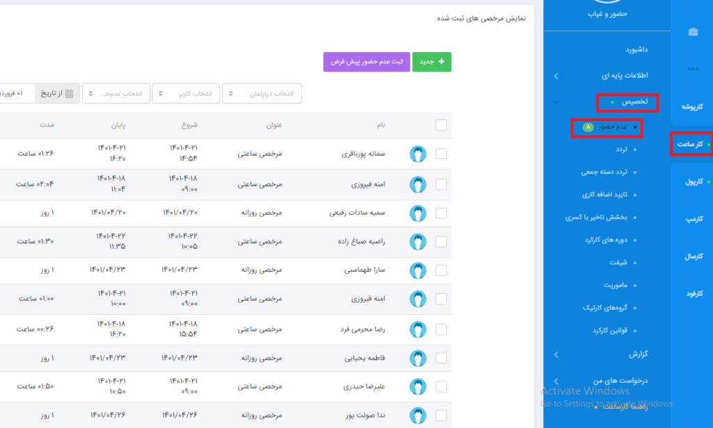 جهت ثبت عدم حضور برای کارمندان و یا تایید درخواست یا رد درخواست ها میتوانید از منوی کارساعت تخصیص عدم حضور را انتخاب نمایید.
