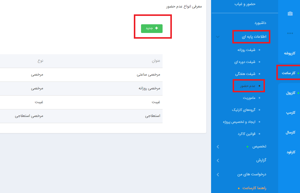در این صفحه لیست انواع عدم حضورها در محل کار قابل مشاهده است. برای درج عدم حضور جدید بر روی دکمه جدید کلیک کنید.