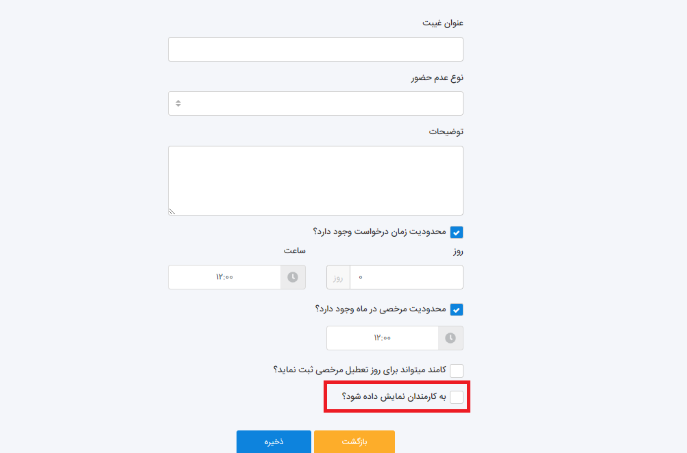 اگر میخواهید همه این موارد به کارمندتان نمایش داده شود باید این گزینه را تیک بزنید. در آخر دکمه ذخیره را کلیک کنید.