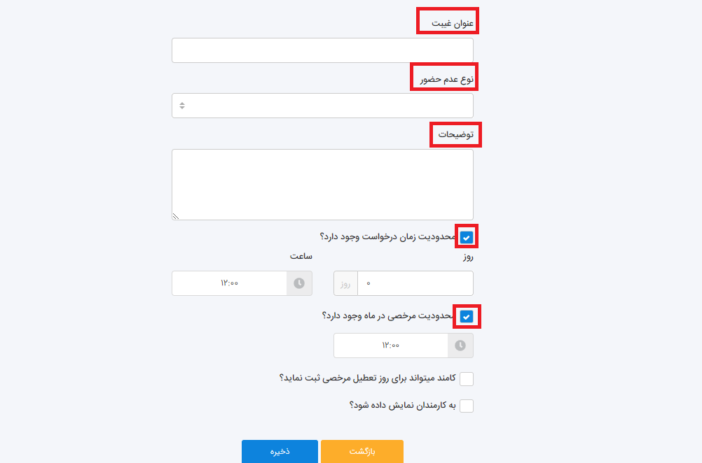 در خصوص محدودیت زمان درخواست باید روز و ساعت آن را مشخص کنید که هر کارمندی چندروز یا چندساعت جلوتر بتواند مرخصی خود را ثبت نماید.