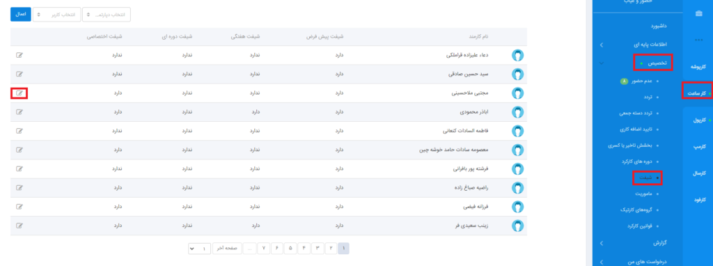 در این بخش وارد کارساعت > تخصیص > شیفت می شوید و روی هر ردیف از اسامی کارمندان که کلیک کنید