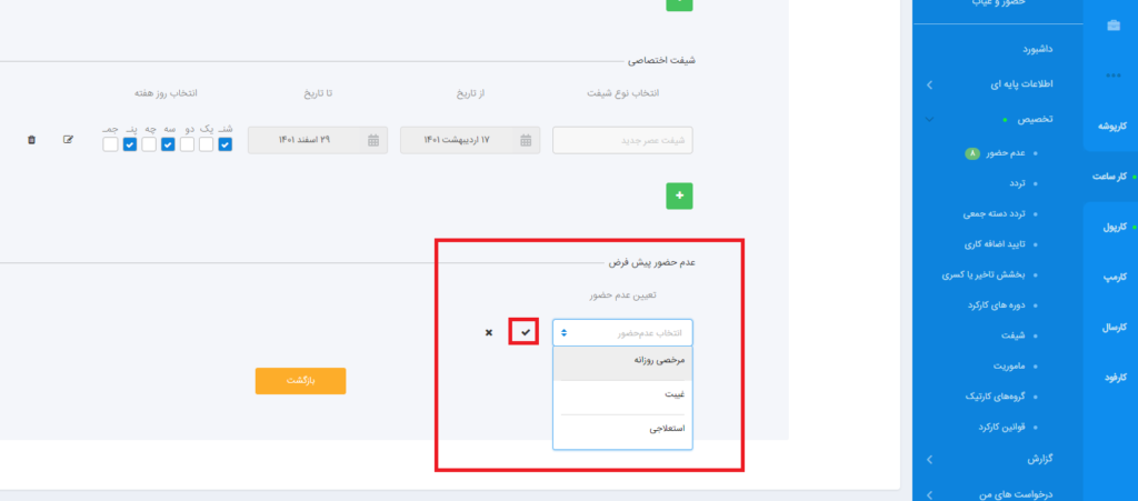 میتوانید وارد بخش مشخص شده شوید و برای عدم حضور آن فرد تعیین کنید که چه عدم حضوری ثبت شود.