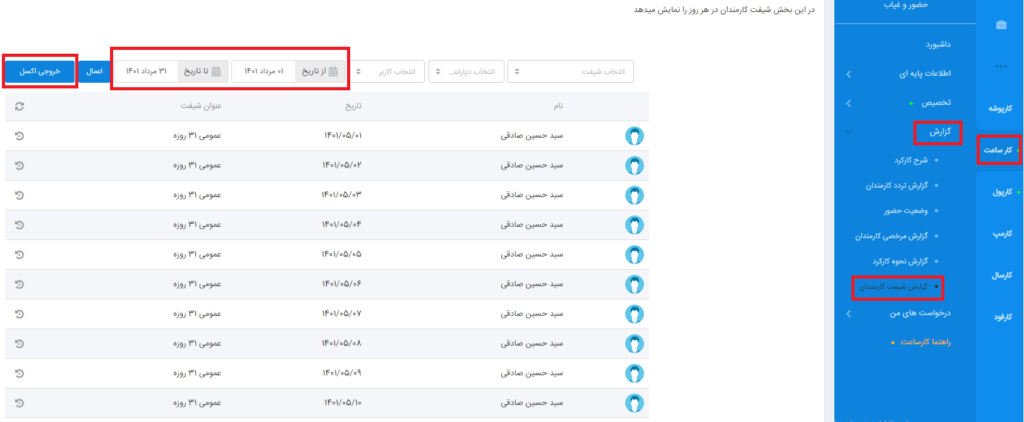 گزارش شیفت های کارمندان کارسو 25 اسفند 1401