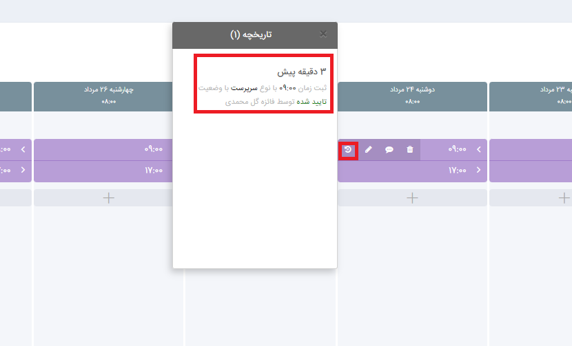 با کلیک بر روی این آیکن می توانید تاریخچه تردد کارمند خود را بررسی کنید.تاریخچه به شما نشان می دهد زمان آن چه ساعتی ثبت و توسط چه کسی این کار انجام شده است.
