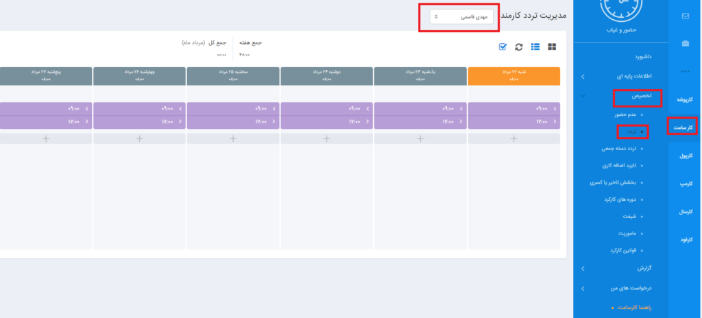 نظارت بر تردد کارمندان یکی از مواردی است که برای مدیریت خیلی مهم است به خصوص اینکه در مواردی که حضور ندارد هم بتواند ورود و خروج کارمندان را مشاهده کند و برای این مورد می توانید از منوی کارساعت > تخصیص > تردد وارد شوید از قسمت مدیریت تردد کارمند ، اسم کارمند موردنظر خود را انتخاب می کنید.