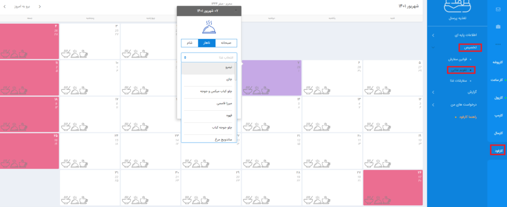 میتوانید تقویم غذایی شرکت را تولید نمایید و برای هر روز، غذاهایی را که در آن روز به کارمندان ارائه میشود را تعیین کنید.
