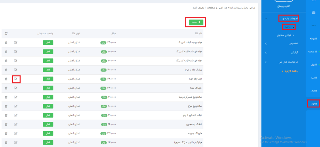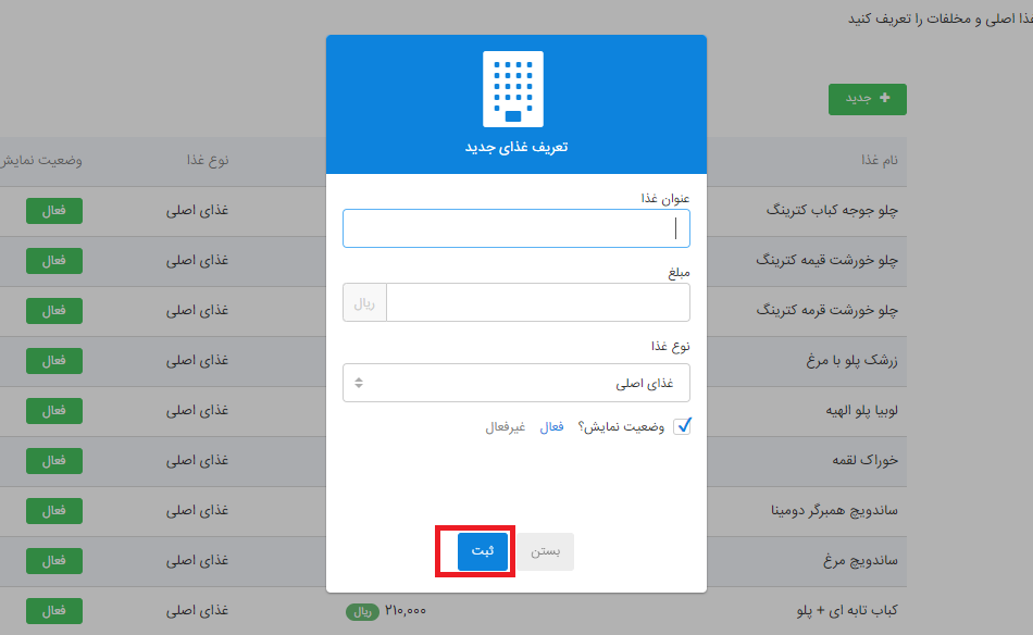 نکته: در صورتی که وضعیت غذا غیرفعال باشد، کارمند نمیتواند آن موارد را سفارش دهد، حتما آن را در حالت فعال قرار دهید تا کارمندان بتوانند برای سفارش لیست غذاها را مشاهده کنند.