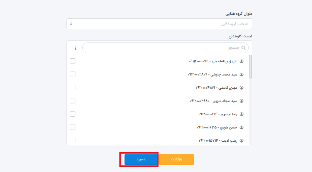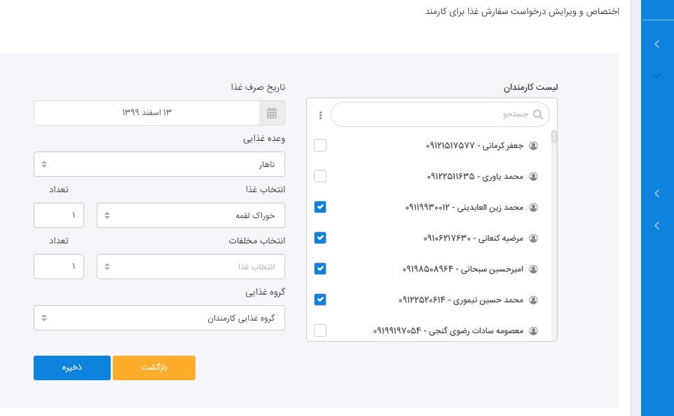 برای درج گروهی سفارش ابتدا از لیست کارمندان موارد مورد نظر را انتخاب نمایید و سپس اطلاعات سفارش را تکمیل نمایید.