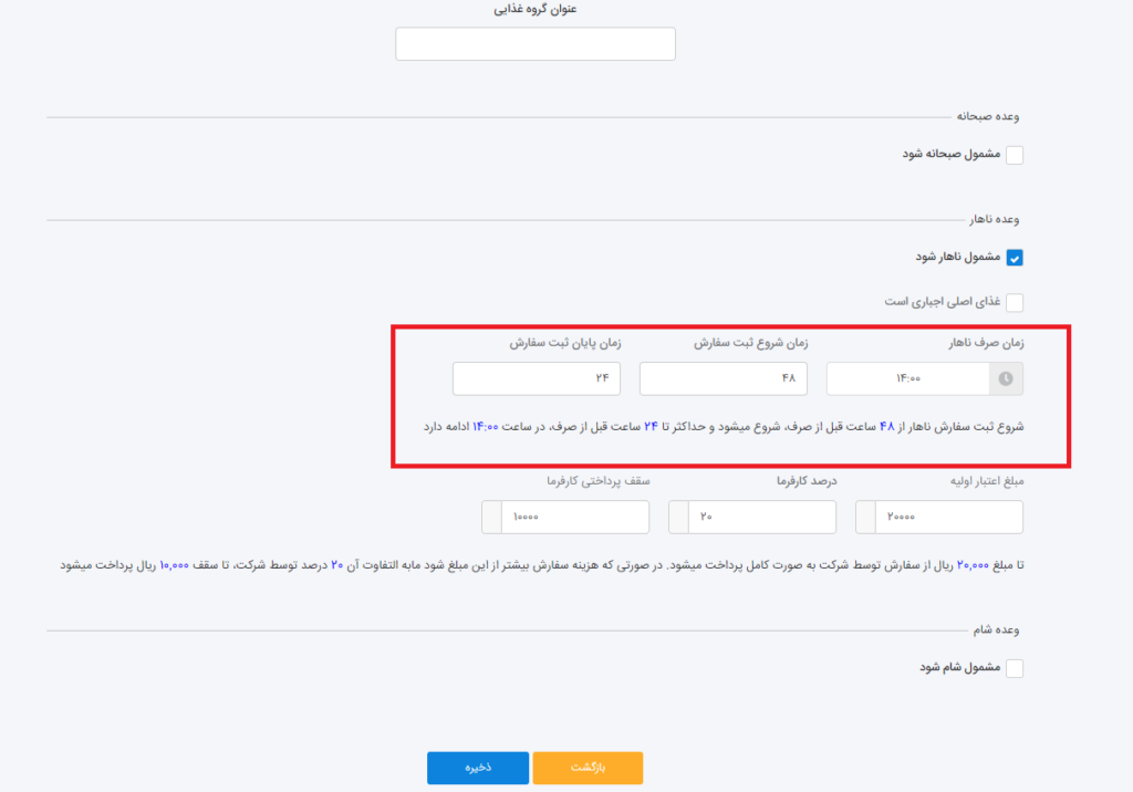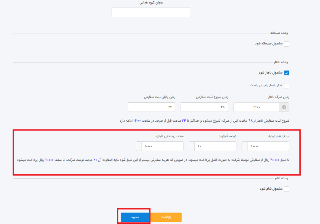 در بخش بعدی مشخص کنید مبلغ غذا به چه نسبتی بین کارفرما و کارمند تقسیم شود.