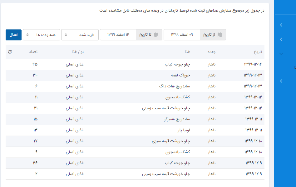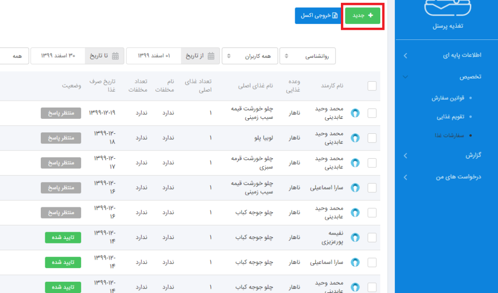 زمانی که کارمندان درخواست سفارش غذا میدهند، مدیران میتوانند در این قسمت سفارشات را مدیریت کنند و نسبت به تایید یا رد سفارشات و همچین درج، حذف و ویرایش اقدام نمایند.