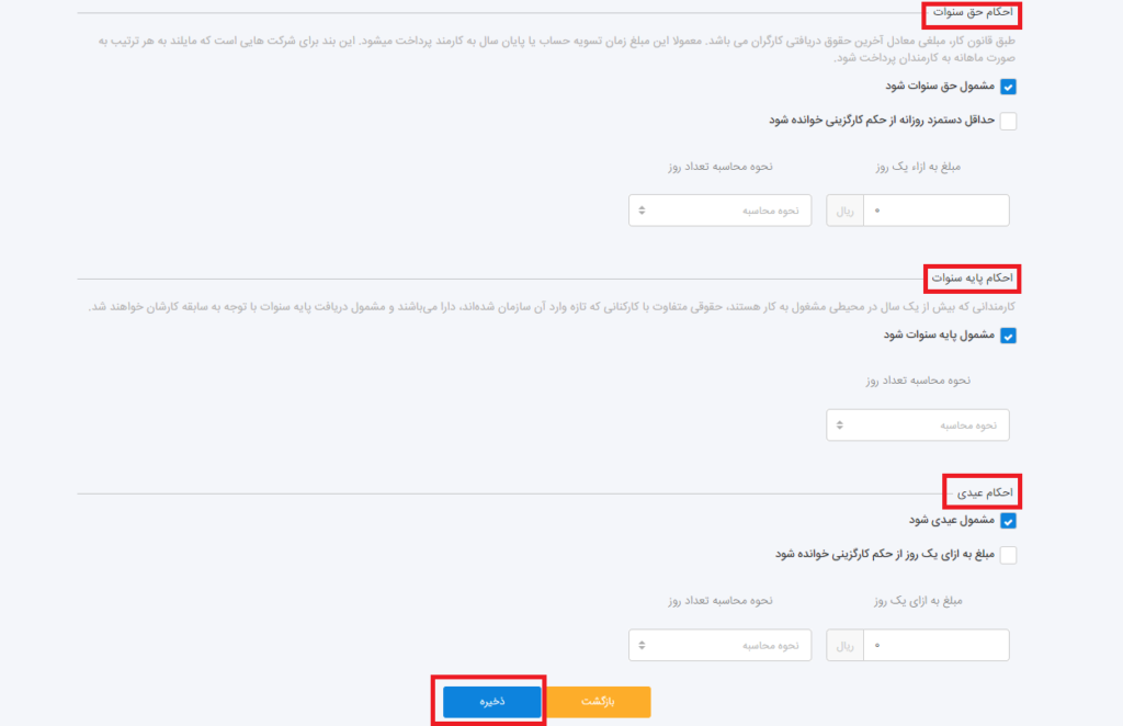 در آخر اگر درصد حق کارمند و کارفرما عددی به جز 23% و 7% محاسبه میشود در فیلدهای مخصوص به خود ثبت شود.