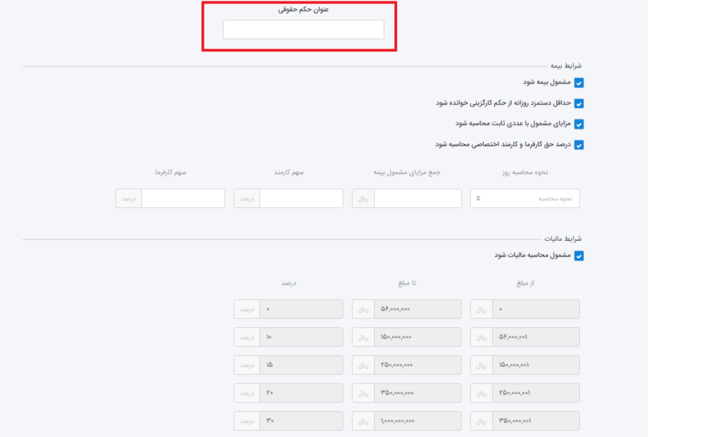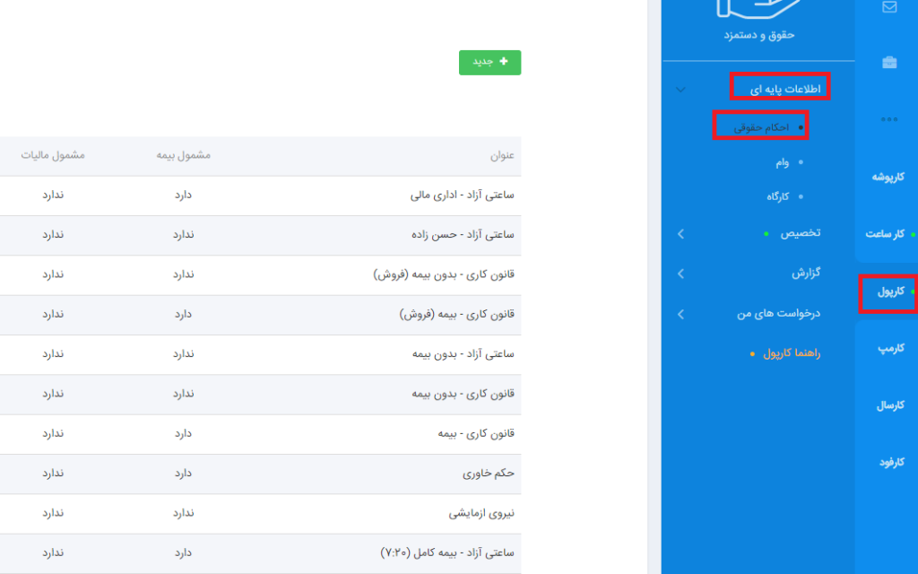 برای دسترسی به این بخش میتوانید از منوی کارپول > اطلاعات پایه ای > احکام حقوقی وارد شوید.