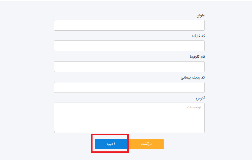 در این بخش عنوان کارگاه،کد کارگاه،نام کارفرما،کد ردیف پیمانی و آدرس آن را ثبت کنید و در آخر روی ذخیره کلیک کنید.