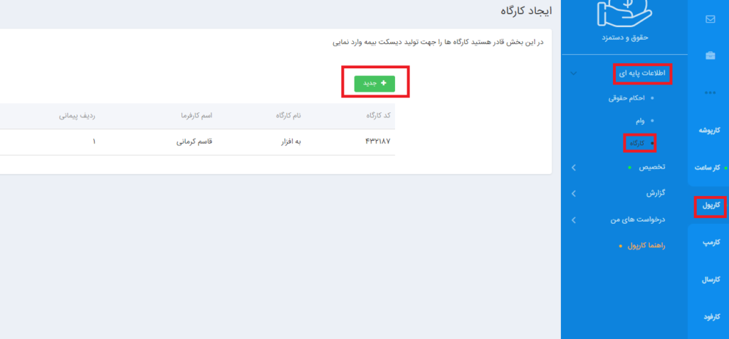 برای دسترسی به این بخش از منوی کارپول > اطلاعات پایه ای > کارگاه وارد شوید و روی کلمه جدید کلیک کنید.