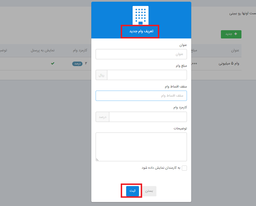 چنانچه گزینه “به کارمند نمایش داده شود” را فعال نمایید، این وام برای کارمندان در دسترس خواهد بود و کارمندان میتوانند این مورد را درخواست دهند.