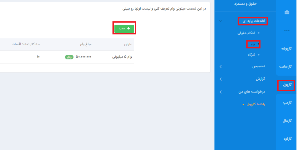 برای این کار از منوی کارپول > اطلاعات پایه ای > وام را انتخاب نمایید.