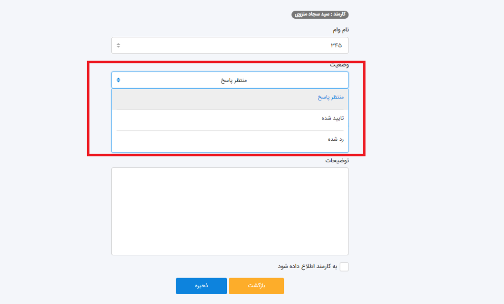 برای تایید، رد و یا ویرایش وام روی دکمه ویرایش بزنید و اطلاعات مورد نظر را تعیین کنید و پس از تایید یا رد درخواست، بر روی ذخیره کلیک کنید.