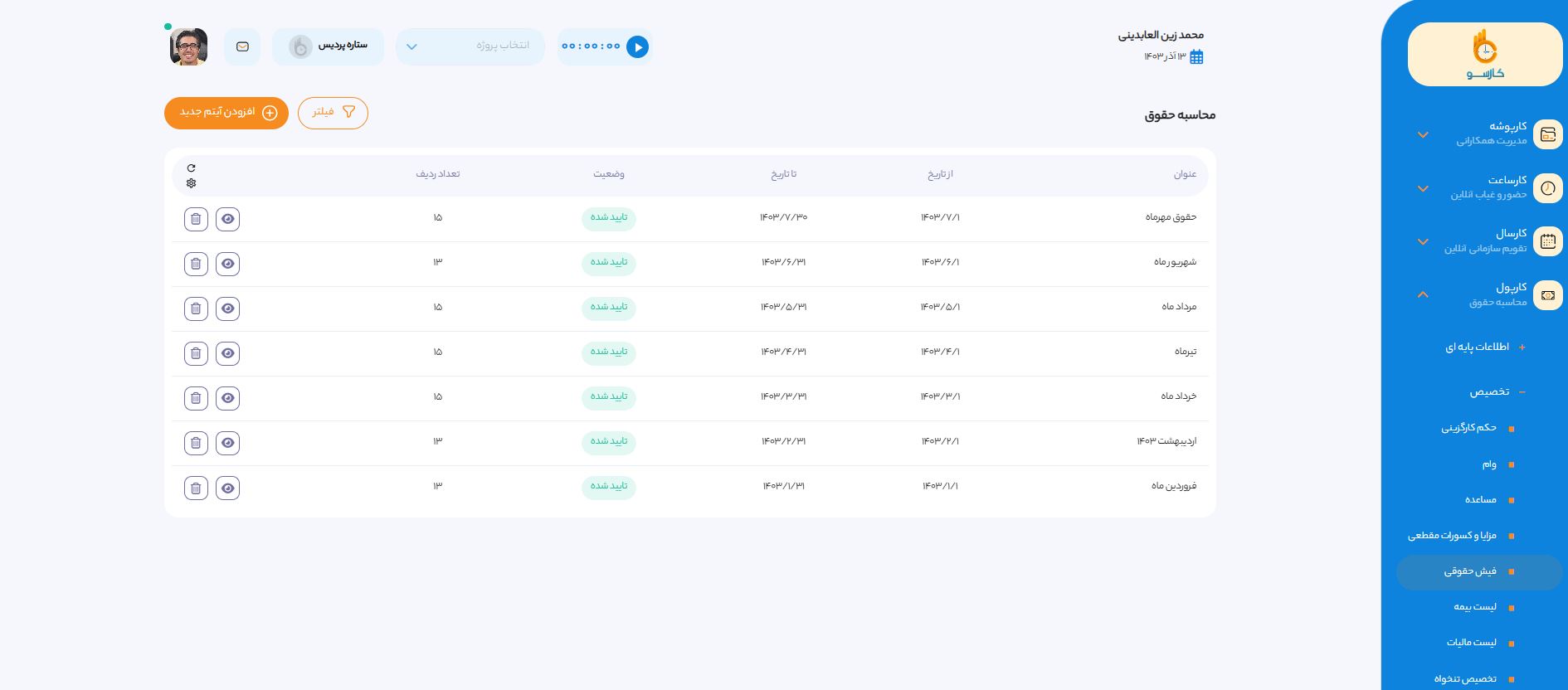 با چند کلیک ساده یک ردیف حقوقی بسازید، کارمندان را به آن اضافه کنید تا حقوق آنها محاسبه شود. بعد از تایید ردیف حقوقی و دریافت خروجی بانک فیش های حقوقی را برای مشاهده توسط کارمندان اشتراک گذاری کنید.