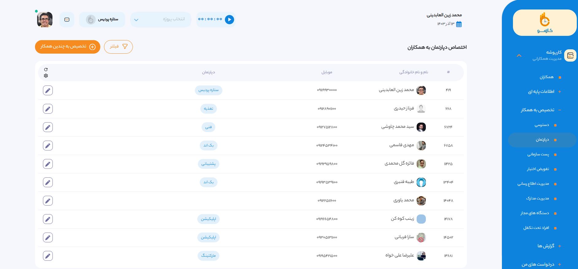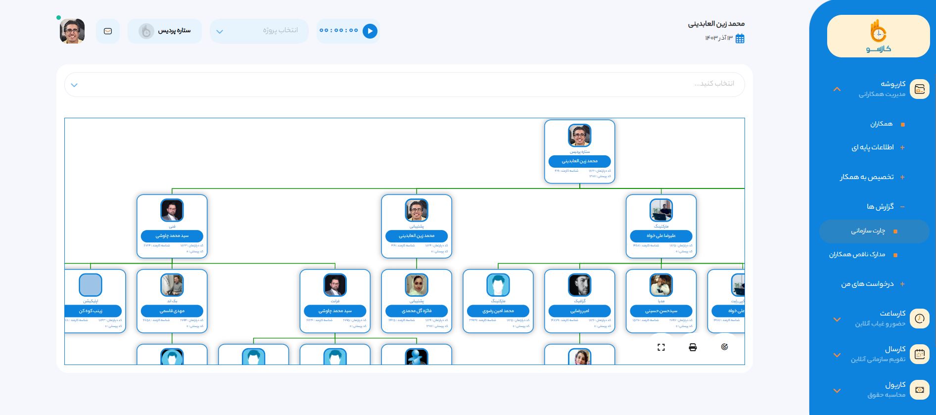 با تعریف چارت سازمانی در سامانه پرسنلی کارپوشه می توانید زنجیره های دپارتمان ها و مدیران و کارمندان هر دپارتمان را مشخص کنید. با این کار طبق درخت واره سازمان، دسترسی مدیران و نیروها ترسیم شده و هر مدیر میتواند نیروهای دپارتمان خود را مدیریت نماید.